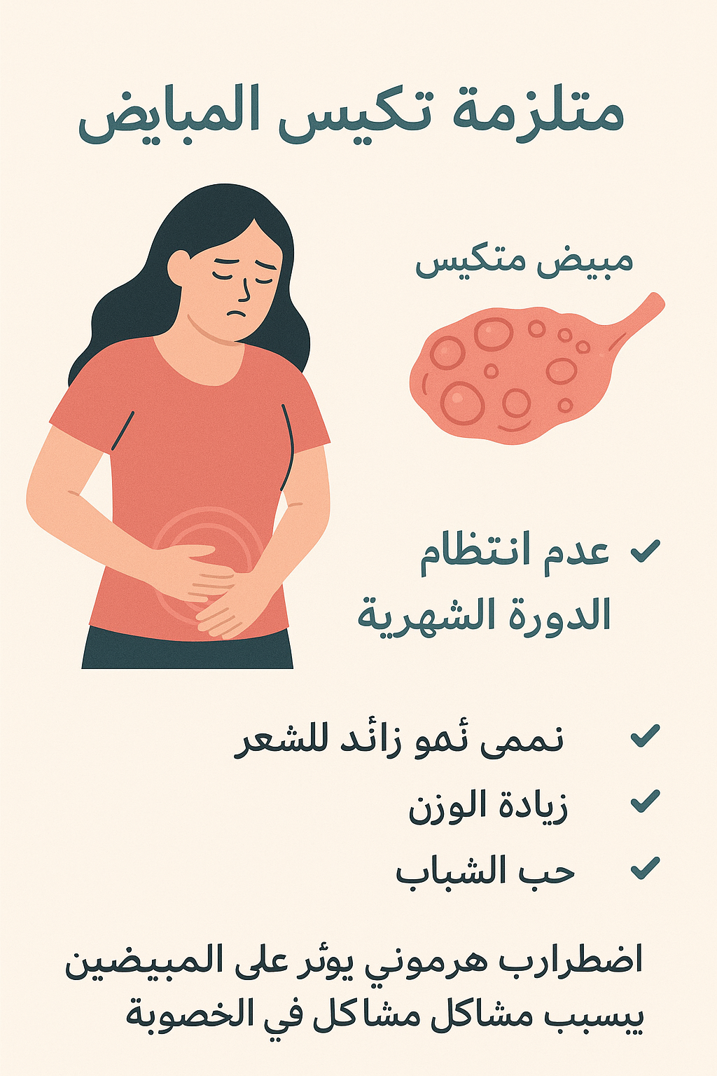 متلازمة تكيس المبايض هي اختلال هرموني يؤثر على أنظمة متعددة في الجسم. النساء المصابات بمتلازمة تكيس المبايض غالبًا ما يعانين من فترات غير منتظمة أو غائبة، وصعوبة في الحمل، وحب الشباب، وزيادة الشعر، وزيادة الوزن، وت thinning الشعر.