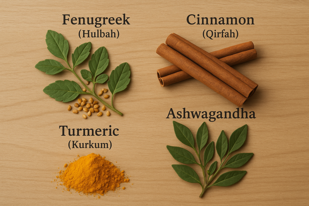 – العلاج بالأعشاب مع الحلبة، القرفة، الكركم، والأشواجندا.